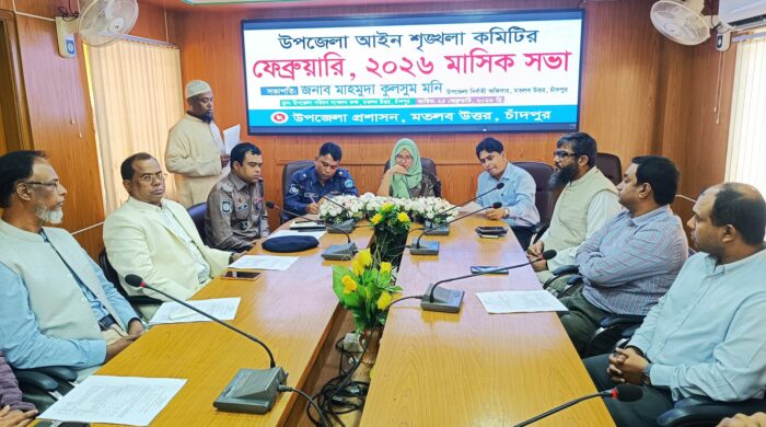 নিজস্ব প্রতিবেদক: চাঁদপুরের মতলব উত্তর উপজেলায় আনশৃঙ্খলা কমিটির মাসিক সভা অনুষ্ঠিত হয়েছে।উপজেলা প্রশাসন আয়োজনে বুধবার (২৫ফেব্রুয়ারি-২০২৬)উপজেলা পরিষদ সভা কক্ষে এ সভা অনুষ্ঠিত হয়। উপজেলা read more